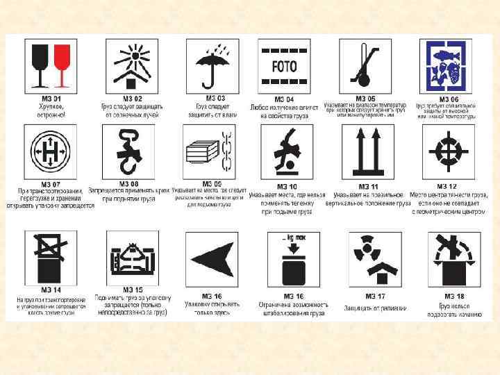 Манипуляционные знаки – знаки, предназначенные для информации о способах (или правилах) обращения с транспортной или потребительской упаковкой товара. Символика, наименование и назначение манипуляционных знаков, наносимых на транспортную тару, регламентируются ГОСТ 14192 -77 «Маркировка грузов» .