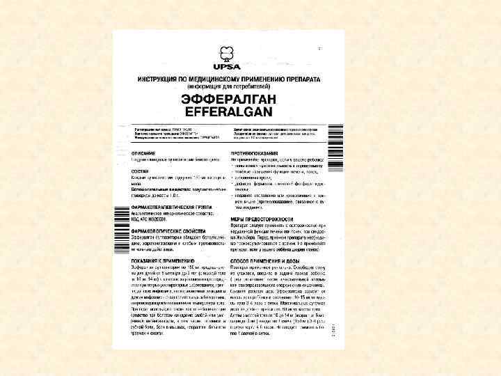 Инструкция по применению должна содержать следующие данные на русском языке: • название и юридический адрес предприятия-производителя; • название лекарственного средства и МНН; • сведения о компонентах, входящих в состав лекарственного средства; • область применения; • противопоказания к применению; • побочное действие; • взаимодействие с другими лекарственными средствами; • дозировки и способ применения; • срок годности; • указание, что лекарственное средство после истечения срока годности не должно применяться; • указание, что лекарственное средство следует хранить в местах, недоступных для детей; • условия отпуска.
