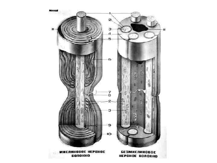 Безмиелиновое нервное волокно Осевой цилиндр прогибает цитолемму леммоцита и продавливается до центра клетки; при этом осевой цилиндр отделен от цитоплазмы цитолеммой леммоцита и подвешан на дупликатуре этой мембраны (мезаксон). В каждую цепочку леммоцитов погружаются одновременно с разных сторон несколько осевых цилиндров и образуется "безмиелиновое волокно кабельного типа".