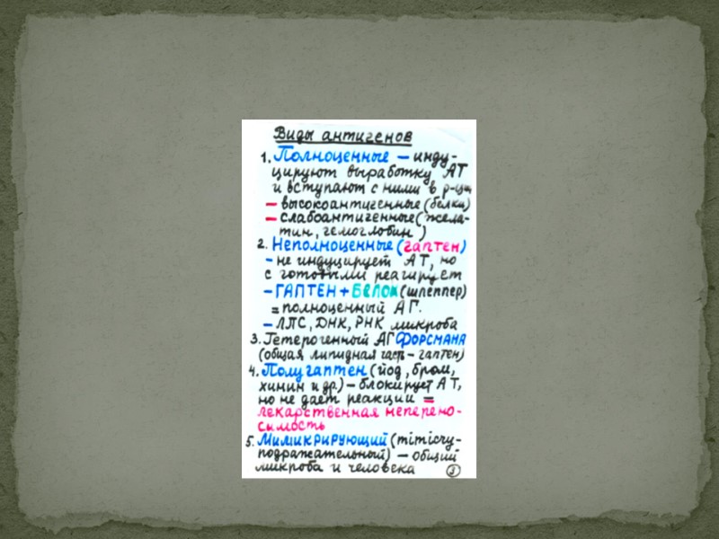 ПОЛНОЦЕННЫЕ – индуцируют выработку АНТИТЕЛ и вступают с ними в реакции: высокоантигенные; слабоантигенные Неполноценные (ГАПТЕНЫ) – не индуцируют образование АНТИТЕЛ, но вступают в реакции с готовыми антителами, образовавшимися – ГАПТЕН + Белок («ШЛЕППЕР») = полноценный антиген (ГАПТЕН – антигенная детерминанта) ПОЛУГАПТЕНЫ (йод, бром, хинин и др.) – блокируют антитела, но не дают реакции = лекарственная непереносимость, другие виды аллергии Мимикрирующие (mimicry – подражение) – общие (схожие) антигенные детерминанты у микроба и человека Виды антигенов