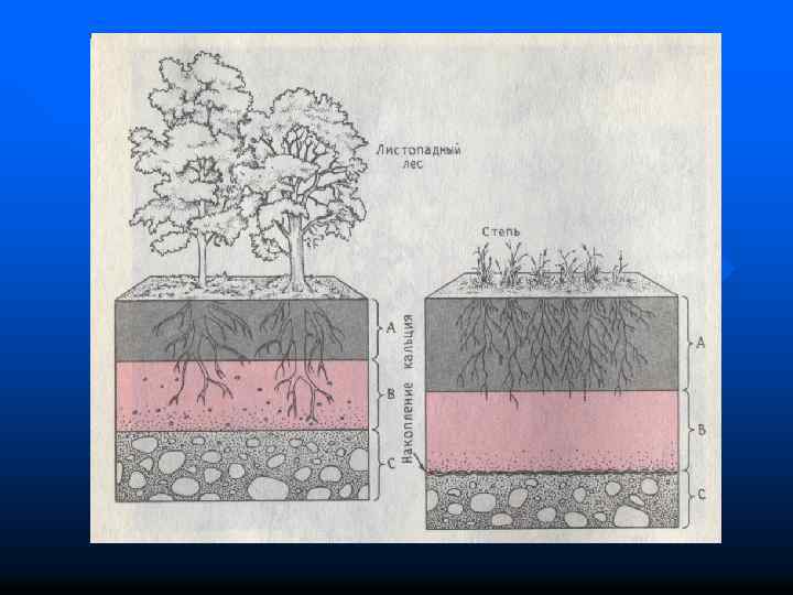Главным компонентом этого горизонта является гумус. Он образуется в результате медленного разложения органических веществ двух верхних горизонтов. Большая часть гумуса не растворяется в воде и помогает удерживать в почве воду и растворимые в воде питательные вещества.