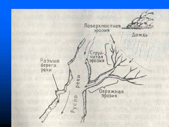 Хозяйственная деятельность человека, приводящая к уничтожению растительного покрова – распашка земель, вырубка лесов, строительство и т. д. – в значительной степени ускоряет эрозию. Эрозию делят на плоскостную (когда поверхностные воды стекают по склону сплошным потоком), струйчатую (когда с большой скоростью текут узкие ручейки) и овражную (когда отдельные ручейки сливаются воедино).