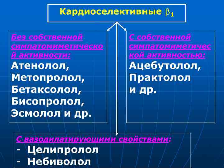 Неселективные 1 - 2 Без собственной симпатомиметической активности: Пропранолол Тимолол Надолол Соталол и др. С собственной симпатомиметической активностью: Бопиндолол Окспренолол Пиндолол Алпренолол Пенбутолол и др. С вазодилатирующими свойствами: Лабеталол (α 1, 1, 2 ) Карведилол, (α 1, 1, 2 ) Картеолол и др.