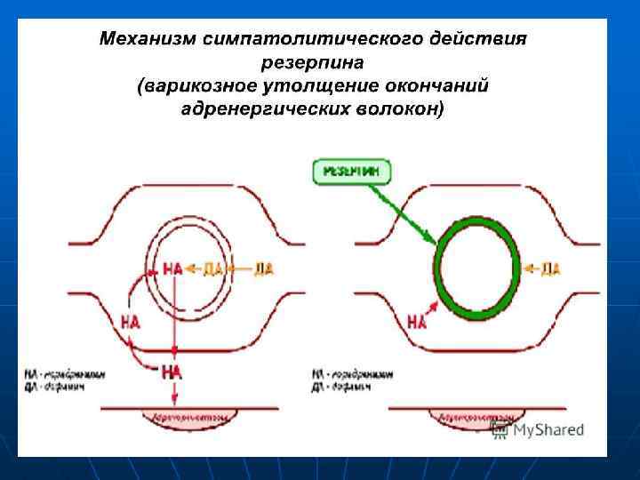 Резерпин n n Депонируется в мембранах везикул, нарушает вход дофамина в везикулы (и, следовательно, синтез норадреналина) нарушает обратный захват норадреналина везикулами, истощает запасы катехоламинов в гранулах, истощает запасы серотонина, нарушает взаимодействие норадреналина с АТФ, а значит - депонирование НА.