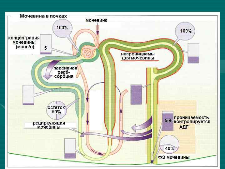 Мочевина и процесс образования мочи • Процессы реабсорбции, секреции и экскреции мочевины весьма важны для всего мочеобразования. Они не только обеспечивают выделение мочевины, но и играют особую роль в механизме осмотического концентрирования мочи. Если в наружной зоне мозгового вещества повышение осмолярности обусловлено главным образом накоплением солей натрия, то во внутреннем слое наряду с ними важную роль играет мочевина. • Наиболее проницаемы для мочевины те участки собирательных трубочек, которые расположены во внутреннем мозговом веществе почки. К тому же проницаемость этих отделов к мочевине регулируется уровнем вазопрессина (АДГ) (стимулятор). • Реабсорбируемая здесь мочевина, создавая высокую осмомолярность интерстиция мозгового вещества, влияет на активность реабсорбции воды. Поэтому при питании малобелковой пищей, когда образуется меньше мочевины, работа концентрационного механизма ухудшается.