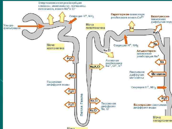 Реабсорбция • Канальцевая реабсорбция происходит во всех отделах, но механизм ее в разных участках канальцев неодинаков. Процессы реабсорбции могут быть активными пассивными или. • Для активного процесса кроме наличия специфических транспортных систем требуется еще и энергия. Пассивные процессы идут без использования энергии на основе физико-химических закономерностей. • Различается реабсорбция в: • а) проксимальных канальцах, • б) петле Генле, • в) дистальных канальцах, • г) собирательных трубочках.