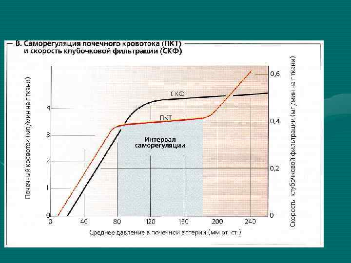 Регуляция фильтрации (кровотока) • Фильтрация определяется: трансмуральным давлением в клубочке и онкотическим давлением в его капиллярах. Колебания значений трансмурального давления, в свою очередь, могут быть вызваны симпатической регуляцией, гормонами и вазоактивными веществами, выделяемыми почками и оказывающими местное действие. • Активация симпатического отдела снижает ЭФД. Сильная активация почечных симпатических нервов способна приводить даже к спазму почечных артериол, снижению кровоснабжению почек и скорость фильтрации. Умеренная и слабая стимуляция оказывает незначительное воздействие на кровоток.