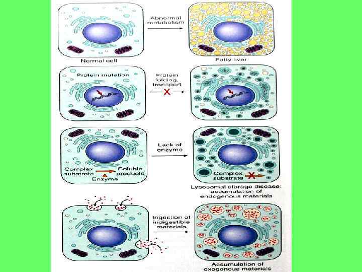 Внутриклеточные накопления (паренхиматозные дистрофии) Выделяют следующие виды паренхиматозных дистрофий: Диспротеинозы (гиалиново-капельная, гидропическая, роговая дистрофии) Внутриклеточные накопления (паренхиматозные дистрофии) Выделяют следующие виды паренхиматозных дистрофий: Диспротеинозы (гиалиново-капельная, гидропическая, роговая дистрофии) Липидозы (приобретенные и наследственные) Углеводные (приобретенные и наследственные)