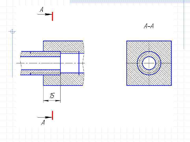 Задание. Выполнить резьбовое соединение стержня с корпусом на глубину 15 мм. На месте вида слева выполнить сечение.