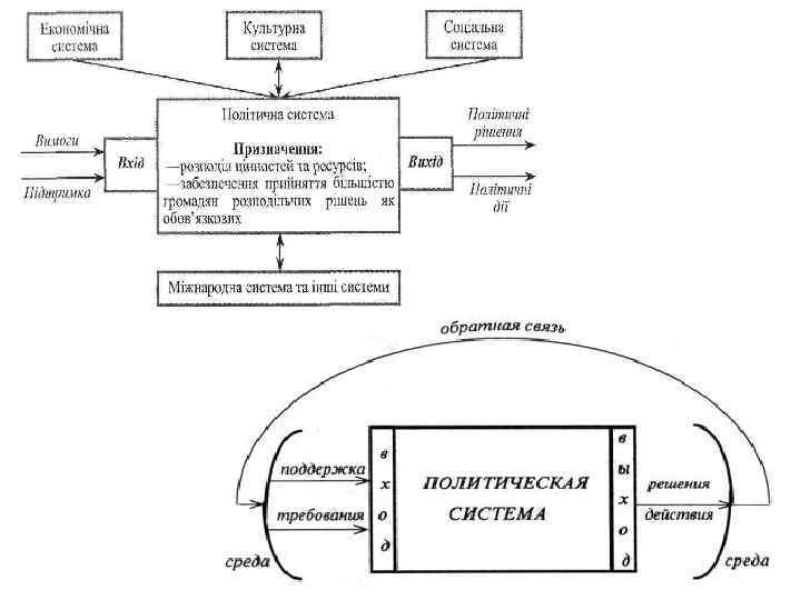 Функції політичної системи Функції ПС за Г. Алмондом Функції входу (введення) Політична соціалізація Агрегування інтересів громадян Функція Функції виходу (виведення) Залучення громадян до політичної участі Здійснення політики Контроль за дотриманням норм Артикуляція інтересів громадян Розробка законів Зміст функції Владноінтегративна Інтеграція суспільства, підтримка стабільності з огляду на цінності й ідеали, як їх розуміють політичні сили Прогностична Визначення мети і завдань суспільства, програми його розвитку Організаційна Мобілізація ресурсів для досягнення цілей, розподіл цінностей (благ, пільг, нагород) Регулятивна Забезпечення легітимності влади, формулювання символів, забезпечення політичної участі громадян