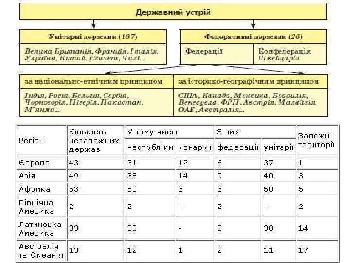 Форма державного правління – спосіб організації державної влади, зумовлений відносинами вищих органів державної влади Монархія (верховна довічна спадкова влада належить одній особі) абсолютна конституційна (парламентська) Республіка (усі вищі органи влади обираються) теократична президентська світська парламентська дуалістична змішана виборна квазі-монархія президентсько- парламентськопарламентська президентська