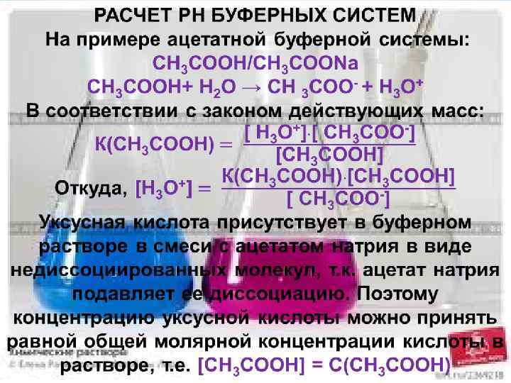 МЕХАНИЗМ ДЕЙСТВИЯ БУФЕРНЫХ СИСТЕМ Например: если к ацетатной буферной системе прилить сильную кислоту (НCl; Н 2 SО 4), то произойдет реакция между ацетат ионами и ионом гидроксония кислоты, что можно выразить уравнением: СН 3 СООNa + НСl → СН 3 СООН + Na. Cl СН 3 СОО- + Н 3 О+ → СН 3 СООН + Н 2 О Сильная хлороводородная кислота замещается слабой уксусной кислотой, посылающей в раствор ничтожно малое количество ионов гидроксония.