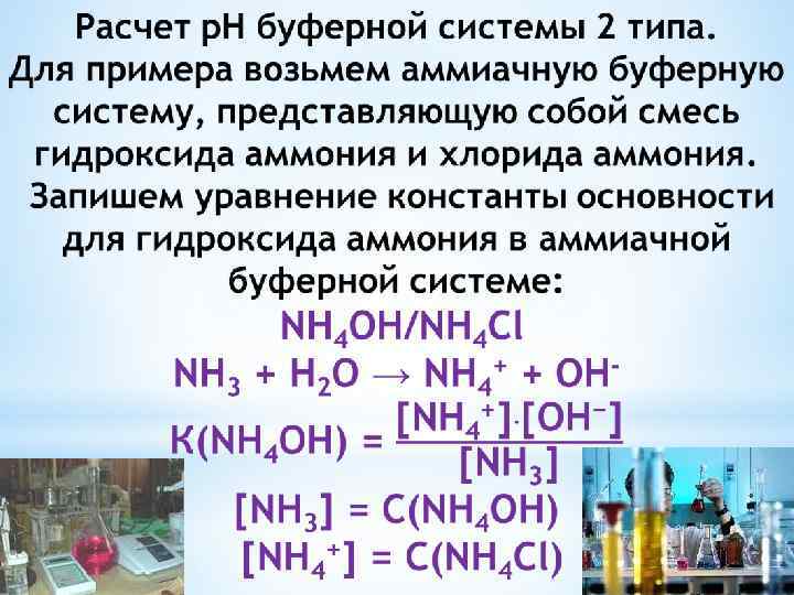 Расчет р. Н слабых оснований: В + Н 2 О ↔ ВН+ + ОНр. ОН = 1/2 р. К(В)- 1/2 lg. C(1/z В) р. Н = 14 - р. ОН р. Н = 14 - 1/2 р. К(В) + 1/2 lg. C(1/z В) Например, чему равен водородный показатель 0, 01 моль/л р-ра гидроксида аммония? NН 3 + Н 2 О ↔ NН 4 ОН + ОНр. Н = 14 - 1/2 р. К(NН 3) + 1/2 lg C(NН 3) р. Н = 14 - 1/2· 4, 76 + 1/2 lg 0, 01 = 14 – 2, 38 – 1 = 10, 62
