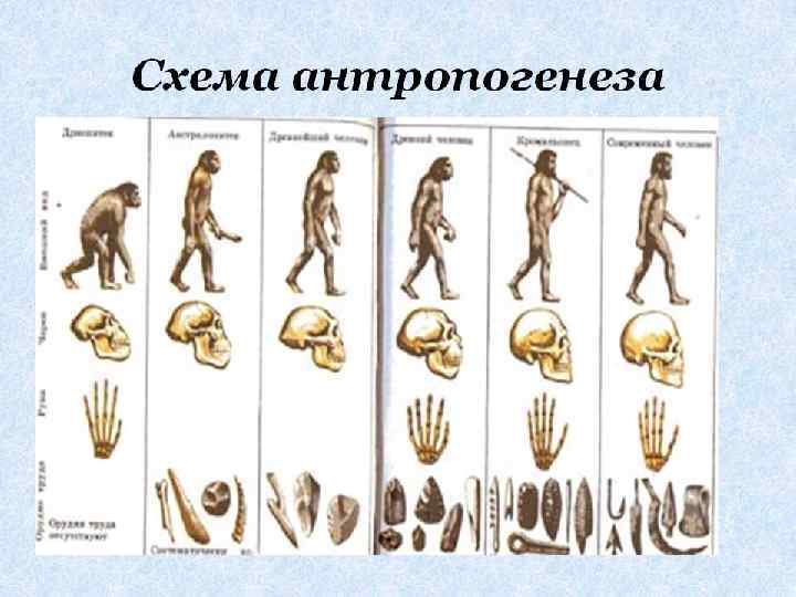 По многим анатомическим и физиологическим признакам имеется значительное сходство между человеком и обезьяной. Это объясняется тем, что человек и обезьяна имели общего предка. Человекообразная обезьяна и человек произошли от древней ископаемой обезьяны—дриопитека (древесная обезьяна). Физическое формирование человека происходило на протяжении длительного времени, и охватывает период более одного миллиона лет. Данные антропологии позволяют последовательно проследить процесс формирования физического строения человека (хотя на сегодня еще не обнаружено, так называемое, промежуточное звено между человеком и обезьяной). А данные археологии - проследить изменения в характере жизнедеятельности предков человека.