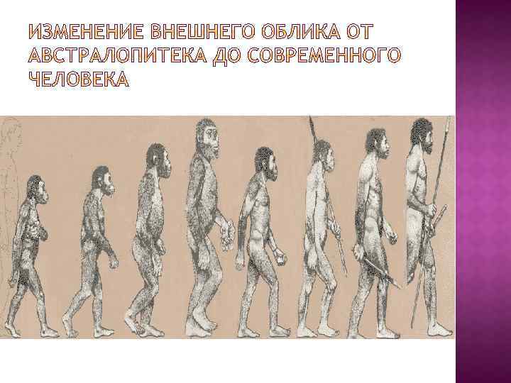 Австралопитеков (букв. «южных обезьян» ) — высокоорганизованных прямоходящих приматов — традиционно было принято считать исходными формами в родословной человека. Австралопитеки получили в наследство от своих древесных предков многие свойства, причём наиболее важными из них были способность и стремление к разнообразному обращению с предметами при помощи рук (манипулированию) и высокое развитие стадных отношений. Они были вполне наземными существами, сравнительно небольших размеров — в среднем длина тела 120– 130 см, вес 30– 40 кг. Их характерной особенностью была двуногая походка и выпрямленное положение тела, о чем свидетельствует строение таза, скелета конечностей и черепа. Свободные верхние конечности давали возможность использовать палки, камни и т. д. Мозговой отдел черепа имел относительно крупные размеры, а лицевая часть была укорочена. Зубы небольшие, располагались плотно, без диастем, с рисунком зубов, характерным для человека. Обитали на открытых равнинах типа саванн. По находкам Луиса Лики возраст австралопитеков определяется в 1, 75 млн. лет.