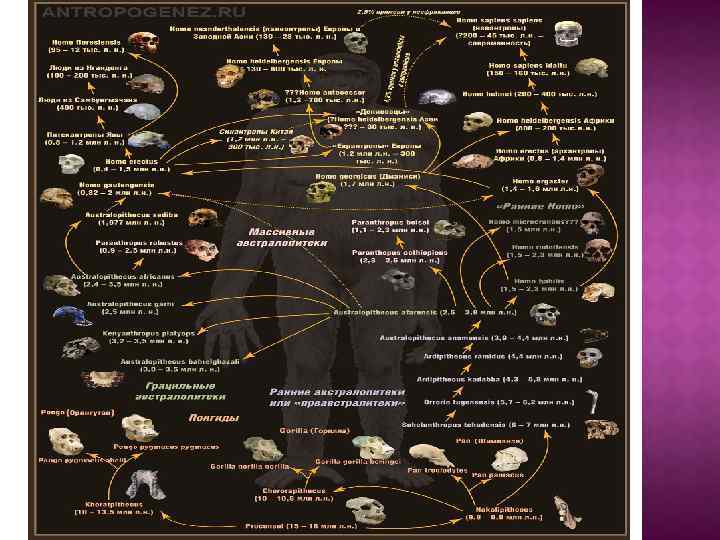 Согласно данной теории, имели место следующие основные стадии эволюции человека: периоды последовательного существования антропоидных предков человека (дриопитек, австралопитек и др. ); существование древнейших людей: питекантропа (древнейшего человека, или протерантропа или архантропа); стадия палеоантропа, то есть древнего человека (неандертальцы и др. ). Развитие современных людей (неоантропов).