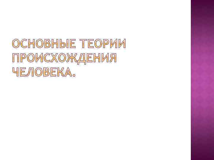 Теория творения (религиозная концепция) Эволюционная теория (научная теория) Теория внешнего вмешательства (паранаучная теория) Теория пространственных аномалий (паранаучная теория)