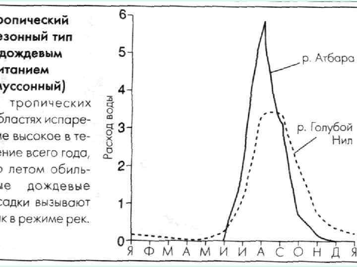 • Реки субтропического типа питаются главным образом зимой дождевыми водами. • Реки тропического типа отличаются малым стоком. Преобладает летнее дождевое питание, зимой осадков мало. • Реки экваториального типа имеют обильное дождевое питание в течение всего года; наибольший сток бывает осенью соответствующего полушария.
