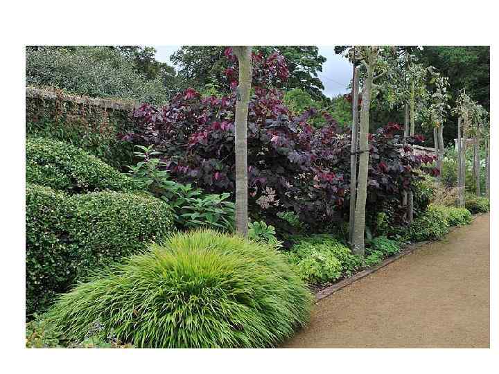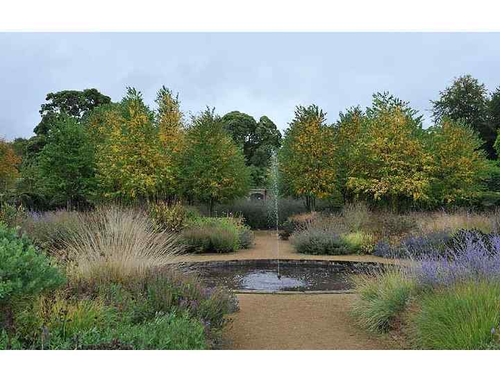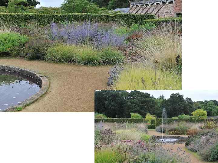 Поместье Скампстон Холл, в котором находится этот сад, существует с XVIII века В центральной части сада в Скампстоне высажены диагональные полосы золотистой молинии — всего шесть с половиной тысяч растений. Слева — квад рат ный пруд, окруженный колоннами из триженого тиса.