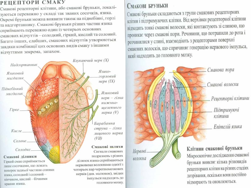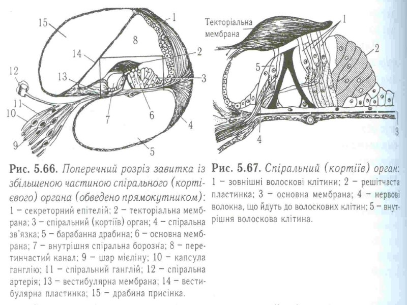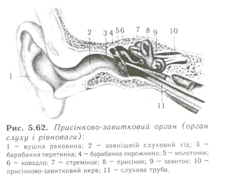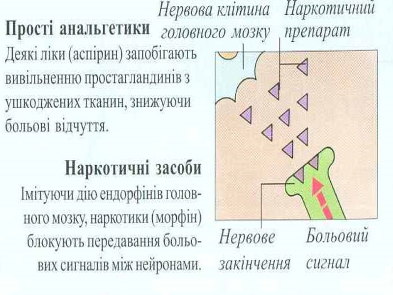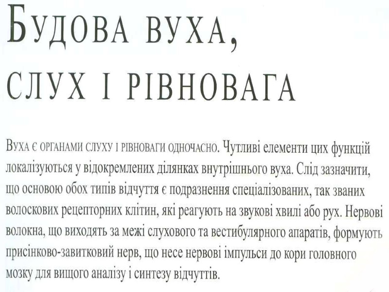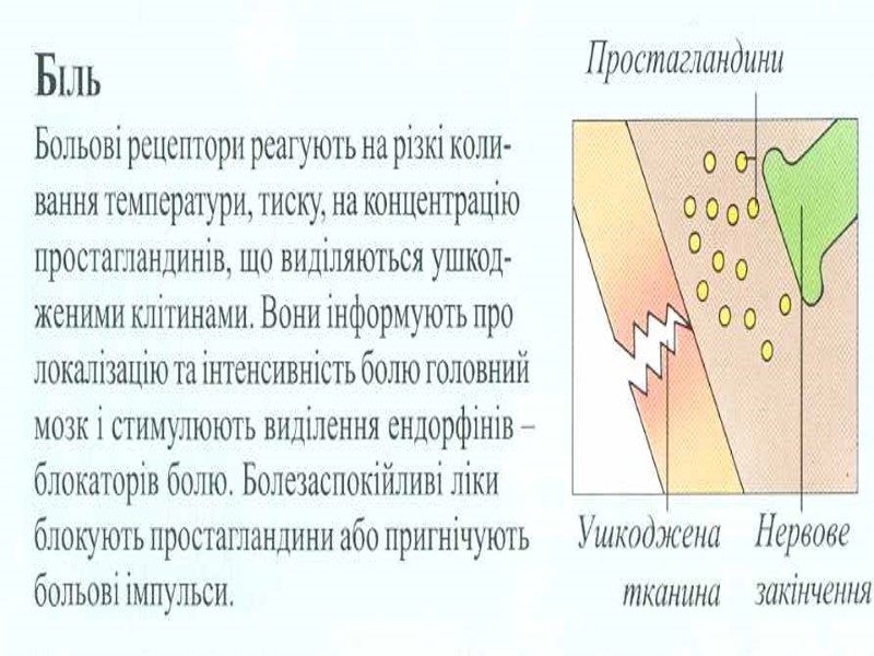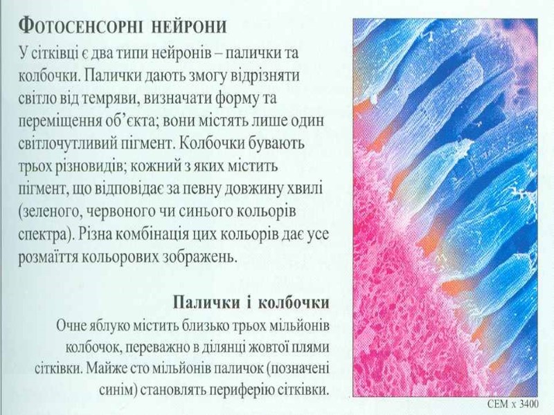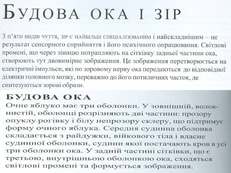Аналізатори зовнішнього і внутрішнього середовища В кожному аналізаторі розрізняють 3 частини: Периферичну (рецепторну), вона представлена органами, в яких знаходяться спеціалізовані рецепторні клітини. По специфічності сприйняття стимулів розрізняють – механорецептори (рецептори органа слуху, рівноваги, тактильні рецептори шкіри, рецептори апарату руху, барорецептори), хеморецептори (органів смаку, нюху, судинні інтерорецептори), фоторецептори (сітчатка ока) , терморецептори (шкіри, внутрішніх органів), больові рецептори. Рецепторні клітини периферичного відділу аналізаторів явл. складовою частиною органів відчуттів (око, вухо і ін) і органів, які виконують в основному не сенсорні функції (ніс, язик і ін) 2. Проміжну (провідникову) частину сенсорної системи представляє мережа вставних нейронів, по яких нервовий імпульс від рецепторних клітин передається до кіркових центрів. На цьому шляху можуть бути проміжні, підкіркові, центри, де відбувається обробка аферентної інформації і переключення її на еферентні центри. 3. Центральну частину СС представляють ділянки кори великих півкуль. В центрі здійснюється аналіз інформації, яка надходить, формування суб»єктивних відчуттів. Тут інформація може бути закладена в довгострокову пам»ять або переключена на еферентні шляхи.