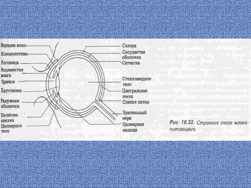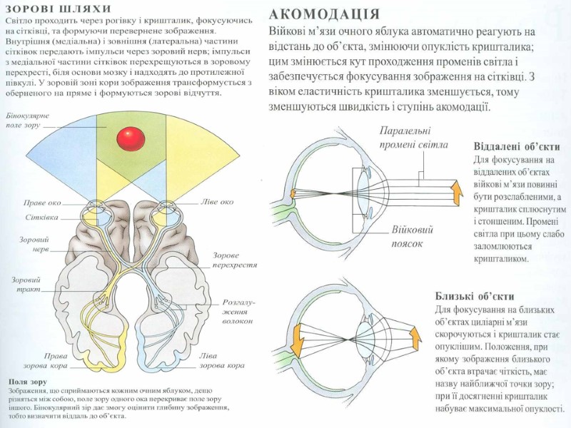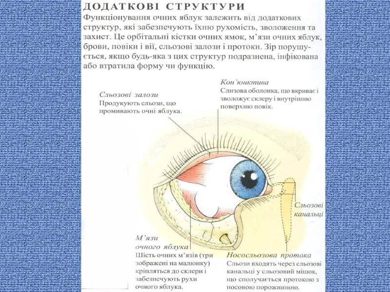 Зорова сенсорна система ОКО – орган зору, який представляє собою периферичну частину зорового аналізатора, в якому рецепторну функцію виконують нейрони сітківки Оболонки ока (зовнішня, в ній розрізняють прозорий відділ – рогівку і задній непрозорий відділ – склеру; середня (судинна) оболонка, приймає участь в обмінних процесах; і внутрішня, чутлива оболонка – сітківка, сенсорна, рецепторна частина, в якій відбувається під дією світла фотохімічні перетворення зорових пігментів, зміна біоелектричної активності нейронів і передача інформації про зовнішнє середовище в підкіркові і кіркові зорові центри) і їх похідні (очні м»язи, повіка і слізний апарат) формують три функціональні апарати: Світлопреломлюючий, або діоптричний (рогівка, рідина передньої і задньої камер ока, кришталик і скловидне тіло) Аккомодаційний (райдужка, війкове тіло з війковими відростками), забезпечує зміну форми і заломлюючу силу кришталика, фокус зображення на сітківці, а також пристосування ока до інтенсивності освітлення. Рецепторний апарат (сітківка)