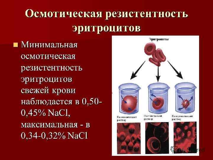 Осмотические свойства крови Na. Cl 0, 5% Изотония Na. Cl 0, 95% вода Na. Cl 0, 95% Гипотония Гипертония Na. Cl 0, 95% вода Na. Cl 2, 0% Осмотическое давление крови – 7, 6 атм.