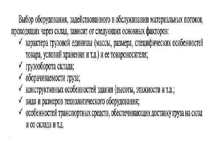 Технико-эксплуатационные требования при выборе ПТО 1. Надежность, прочность, устойчивость, высокий КПД, безопасность, масса соответствующая складу. 2. Соответствие мощности ПТО условиям работ и пропускной способности склада. 3. Грузоподъемность ПТО > максимальной массы перерабатываемого на складе груза. 4. Однотипность или универсальность ПТО. 5. Соответствие видов и размеров рабочих органов ПТО особенностям перерабатываемого груза. 6. Учет энергетической возможности склада, экономической целесообразности, технологической необходимости и экологических требований.