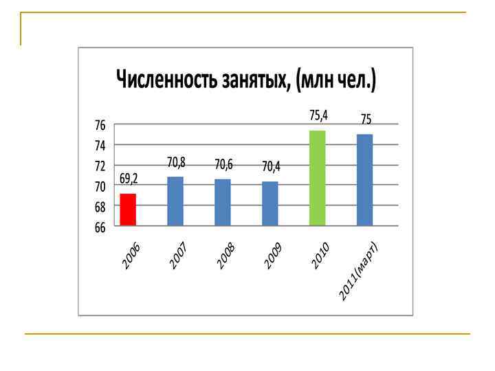 Показатели занятости 2000 2005 2006 2007 2008 2009 2010 Всего в экономике, тыс. чел. 64517 66792 67174 68019 68474 67463 67577 Всего в экономике, в % к итогу 100 100 государственная, муниципальная 37, 8 33, 7 32, 8 32, 1 31, 5 31, 3 30, 4 частная 46, 1 54, 1 55, 4 56, 3 57, 1 57, 8 58, 6 собственность общественных и религиозных организаций (объединений) 0, 8 0, 6 0, 5 смешанная российская 12, 6 7, 8 7, 2 6, 7 6, 2 5, 7 иностранная, совместно российская и иностранная 2, 7 3, 8 4 4, 3 4, 7 4, 8 в т. ч. по формам собственности: