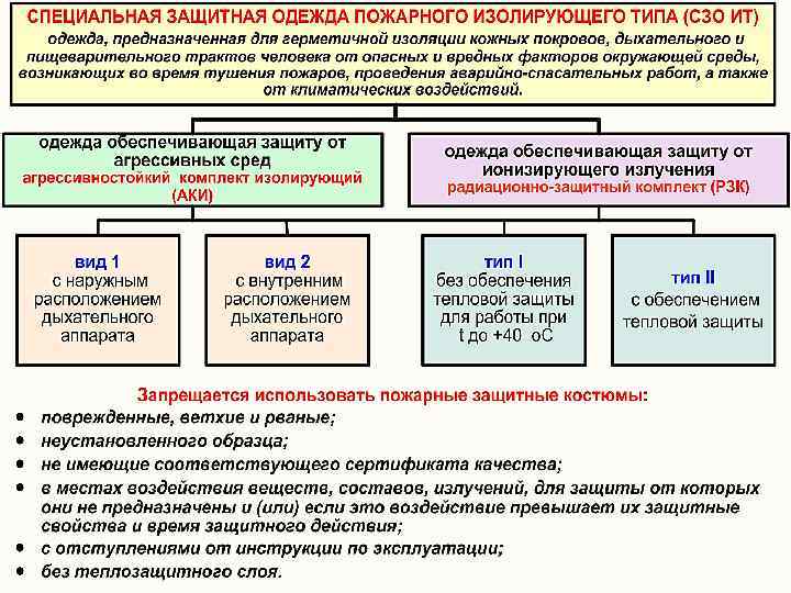 Пожарные защитные костюмы (боевая одежда пожарного, теплоотражательный, газохимический, радиационно-защитный костюмы) должны обеспечивать безопасность и быть удобными при работе личного состава подразделений ГПС на пожарах, пожарнотактических учениях и занятиях по решению пожарно-тактических задач в сложных условиях, а также защиту от воздействия лучистой энергии и тепловых потоков пламени, ионизирующего излучения, сильнодействующих ядовитых и химических веществ, воды и растворов химических соединений. Запрещается использовать пожарные защитные костюмы: v поврежденные, ветхие и рваные; v неустановленного образца; v не имеющие соответствующего сертификата качества; v в местах воздействия веществ, составов, излучений, для защиты от которых они не предназначены и (или) если это воздействие превышает их защитные свойства и время защитного действия; v с отступлениями от инструкции по эксплуатации; v без теплозащитного слоя.