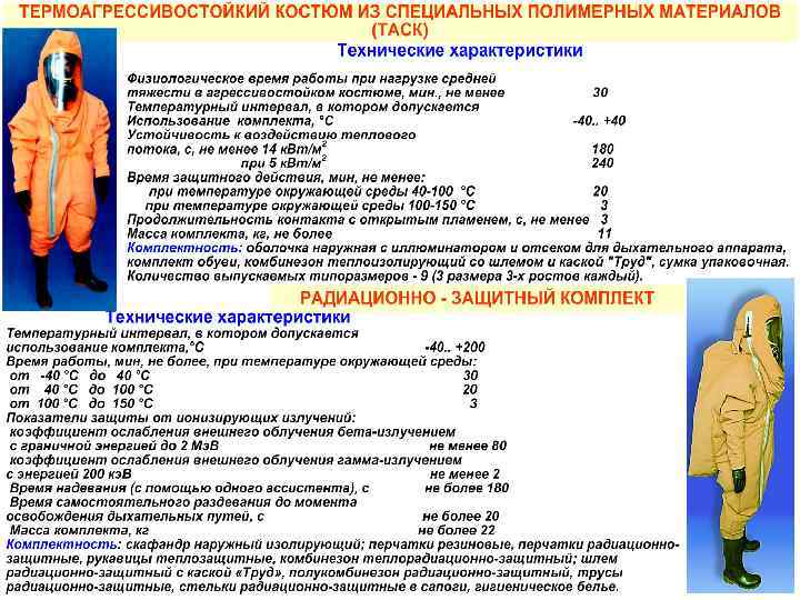 ПОЖАРНЫЕ ЗАЩИТНЫЕ КОСТЮМЫ 301. Пожарные защитные костюмы (боевая одежда пожарного, теплоотражательный, газохимический, радиационно-защитный костюмы) должны обеспечивать безопасность и быть удобными при работе личного состава подразделений ГПС на пожарах, пожарно-тактических учениях и занятиях по решению пожарно-тактических задач в сложных условиях, а также защиту от воздействия лучистой энергии и тепловых потоков пламени, ионизирующего излучения, сильнодействующих ядовитых и химических веществ, воды и растворов химических соединений. 302. Запрещается использовать пожарные защитные костюмы: поврежденные, ветхие и рваные; неустановленного образца; не имеющие соответствующего сертификата качества; в местах воздействия веществ, составов, излучений, для защиты от которых они не предназначены и (или) если это воздействие превышает их защитные свойства и время защитного действия; с отступлениями от инструкции по эксплуатации; без теплозащитного слоя.