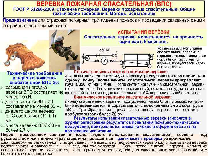 СТАТЬЯ 122. ТРЕБОВАНИЯ К СРЕДСТВАМ САМОСПАСАНИЯ ПОЖАРНЫХ. Средства самоспасания пожарных (веревка пожарная, пояс пожарный и карабин пожарный) должны выдерживать статическую нагрузку не менее 10 килоньютонов, обеспечивать возможность страховки пожарных при работе на высоте и самостоятельного спуска пожарных с высоты. СТАТЬЯ 123. ТРЕБОВАНИЯ К СРЕДСТВАМ ИНДИВИДУАЛЬНОЙ ЗАЩИТЫ И СПАСЕНИЯ ГРАЖДАН ПРИ ПОЖАРЕ 1. Средства индивидуальной защиты и спасения граждан при пожаре должны обеспечивать безопасность эвакуации или самоспасания людей. При этом степень обеспечения выполнения этих функций должна характеризоваться показателями стойкости к механическим и неблагоприятным климатическим воздействиям, эргономическими и защитными показателями, которые устанавливаются исходя из условий, обеспечивающих защиту людей от токсичных продуктов горения, в том числе от оксида углерода, при эвакуации из задымленных помещений во время пожара и спасания людей с высотных уровней из зданий, сооружений и строений. 2. Конструкция средств индивидуальной защиты и спасения граждан при пожаре должна быть надежна и проста в эксплуатации и позволять их использование любым человеком без предварительной подготовки. 3. Область применения, функциональное назначение и технические характеристики средств индивидуальной защиты и спасения граждан при пожаре (до принятия соответствующего технического регламента) определяются нормативными документами по пожарной безопасности.