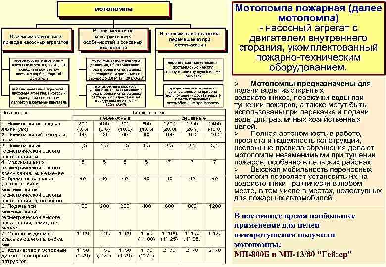 5 -й учебный вопрос. Пожарные мотопомпы – назначение, классификация, состав противопожарного оборудования и основные технические характеристики.