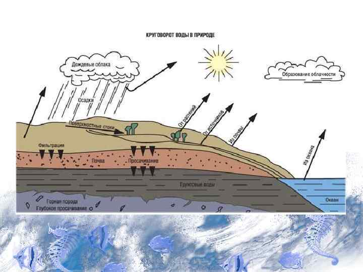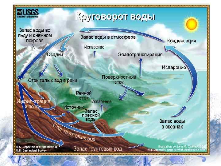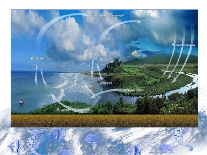 7. Круговорот воды в природе • Вода постоянно находится в движении циркуляции. Ее перемещение происходит в результате механического движения потоки воды в реках, течения в толще океана; в результате изменения фазового состава - вода испаряется и попадает в атмосферу посредством диффузионного и конвективного потоков.