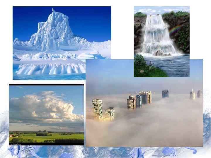• В атмосфере вода встречается в парообразном состоянии в воздушной оболочке, окружающей Землю, • в капельно-жидком состоянии - в облаках, туманах и в виде дождя, • твердом - в виде снега, града и кристалликов льда высоких облаков.