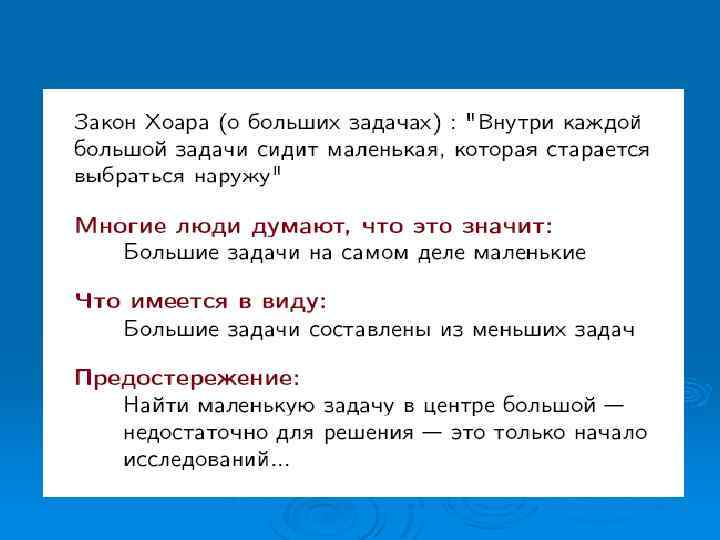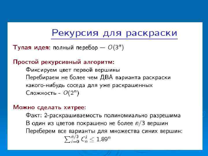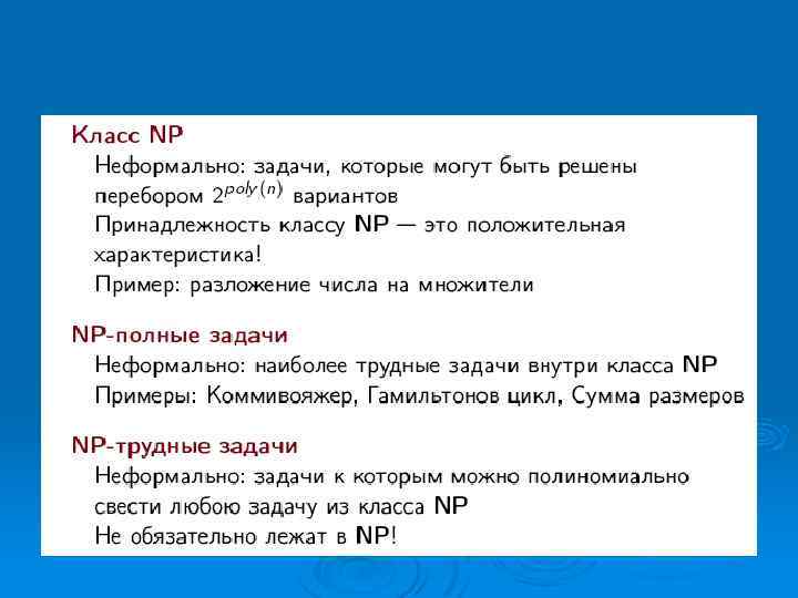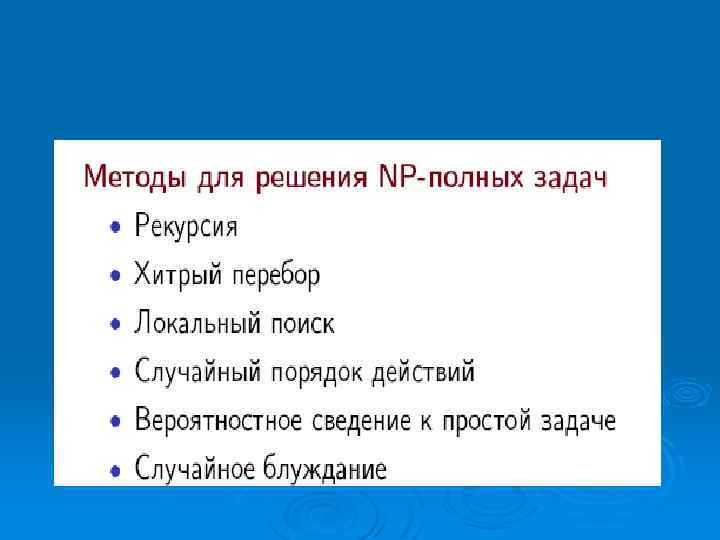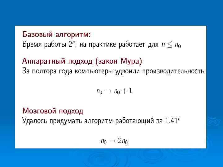Проблемы, которые невозможно решить за полиномиальное время, называют нерешаемыми, потому что нахождение их решений быстро становится невозможным. Ø Нерешаемые проблемы иногда называют трудными. Ø Замечание некоторые проблемы принципиально неразрешимы, то есть даже отвлекаясь от временной сложности, невозможно создать алгоритм их решения Ø