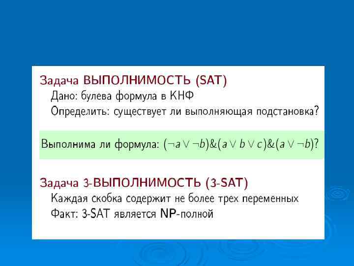 Задачи не попадающие ни в класс P, ни в класс E Ø Ø Ø задача о выполнимости: существует ли для данной булевской формулы, находящейся в КНФ, такое распределение истинностных значений, что она имеет значение И? задача коммивояжера; решение систем уравнений с целыми переменными; составление расписаний, учитывающих определенные условия; размещение обслуживающих центров (телефон, телевидение, срочные службы) для максимального числа клиентов при минимальном числе центров;