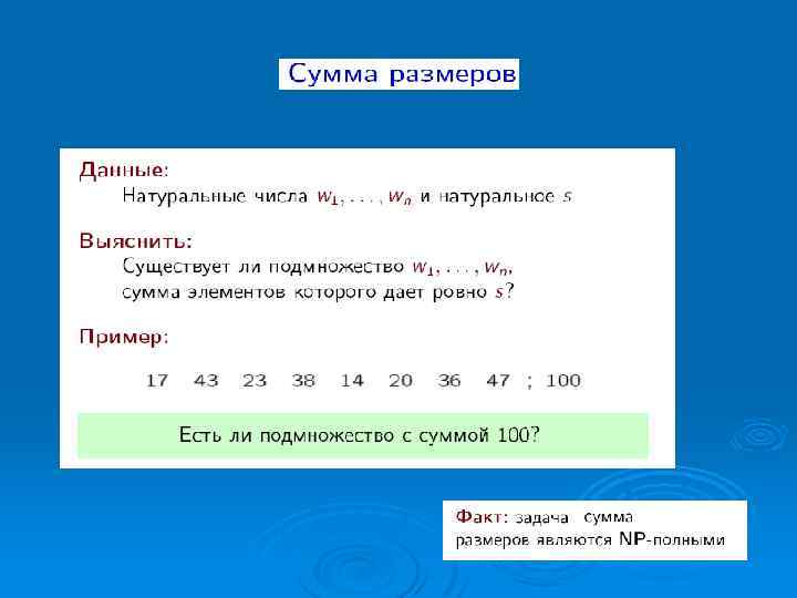 оптимальная загрузка емкости (рюкзак, поезд, корабль, самолёт) при наименьшей стоимости; Ø оптимальный раскрой (бумага, картон, стальной прокат, отливки), оптимизация маршрутов в воздушном пространстве, инвестиций, станочного парка; Ø задача распознавания простого числа; Ø