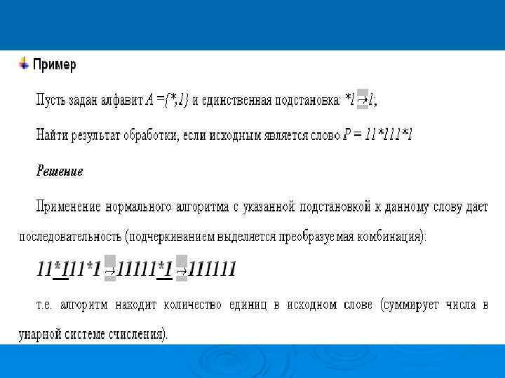 Нормальный алгоритм Маркова Ø задается алфавитом А и нормальной схемой подстановок, Ø где алфавит - конечное, непустое множество элементов называемых буквами. Различные сочетания букв образуют слова