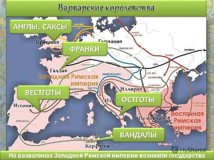 ВОЗНИКНОВЕНИЕ РАННЕСРЕДНЕВЕКОВОЙ ГОСУДАРСТВЕННОСТИ В ЕВРОПЕ IV-VIII вв. Великое переселение народов Синтезный путь развития Германцы завоевали территории Римской империи в Западной Европе. Здесь в V - VI I вв. сложились так называемые варварские королевства: Франкское, Вестготское, Лангобардское и др. , в которых на основе синтеза элементов разлагавшегося родоплеменного строя германцев и остатков античных общественных отношений постепенно формируется новое, феодальное общество.