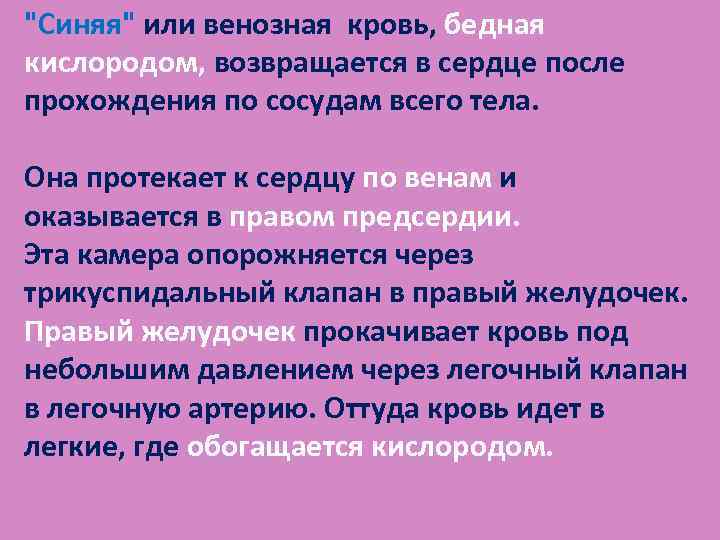 "Синяя" или венозная кровь, бедная кислородом, возвращается в сердце после прохождения по сосудам всего тела. Она протекает к сердцу по венам и оказывается в правом предсердии. Эта камера опорожняется через трикуспидальный клапан в правый желудочек. Правый желудочек прокачивает кровь под небольшим давлением через легочный клапан в легочную артерию. Оттуда кровь идет в легкие, где обогащается кислородом.