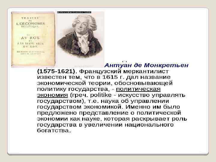Меркантилизм (XVI-XVII вв. ) Представители: Уильям Стаффорд, Томас Мен § Поиск источника богатства нации - в сфере обмена (обращения).