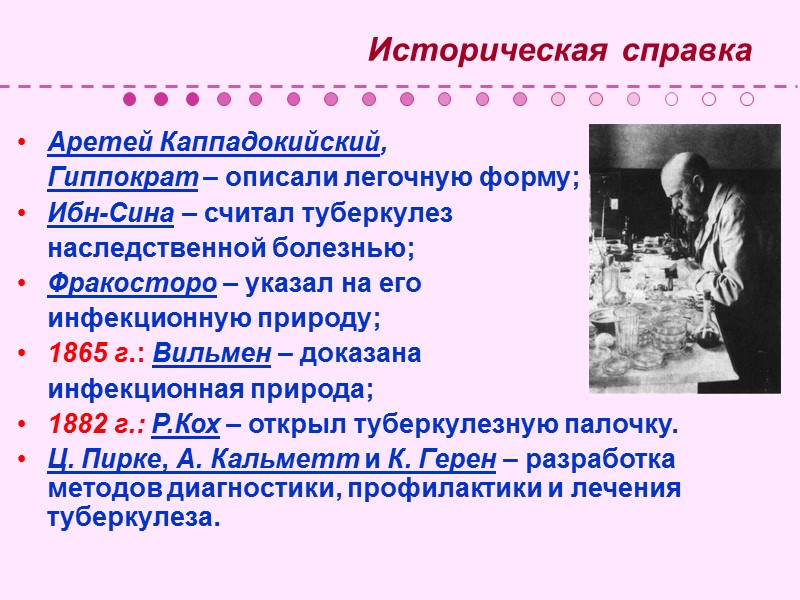 Историческая справка Аретей Каппадокийский, Гиппократ – описали легочную форму; Ибн-Сина – считал туберкулез наследственной болезнью; Фракосторо – указал на его инфекционную природу; 1865 г.: Вильмен – доказана инфекционная природа; 1882 г.: Р.Кох – открыл туберкулезную палочку. Ц. Пирке, А. Кальметт и К. Герен – разработка методов диагностики, профилактики и лечения туберкулеза.