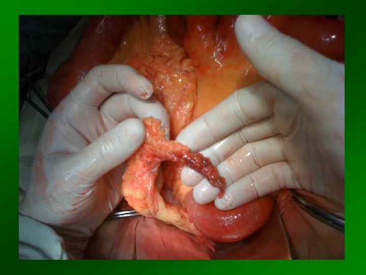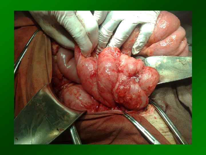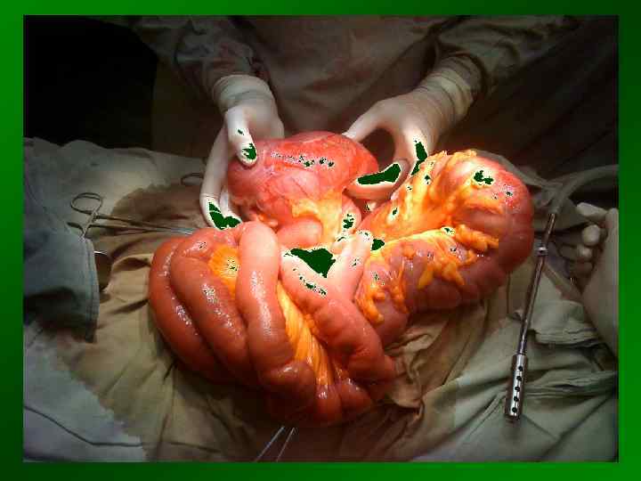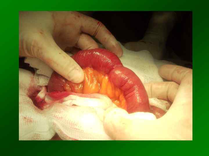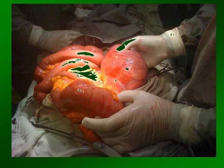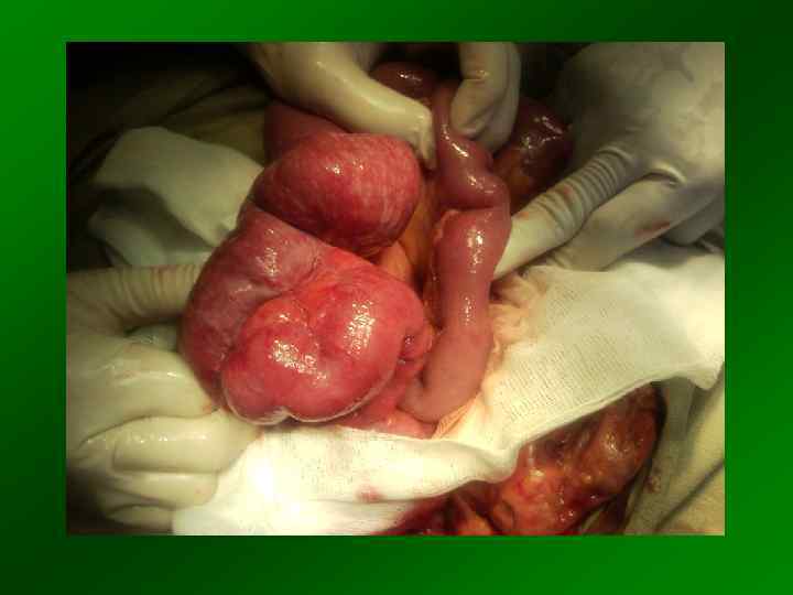 ЗАВОРОТ ТОНКОЙ КИШКИ Клиническая картина заворота отличается особой тяжестью и зависит от количества завернувшихся петель кишки. Тактика: развернуть заворот, определить жизнеспособность стенки кишки, резецировать нежизнеспособный участок кишки. Заворот илеоцекального отдела кишечника