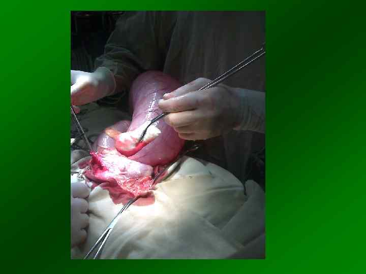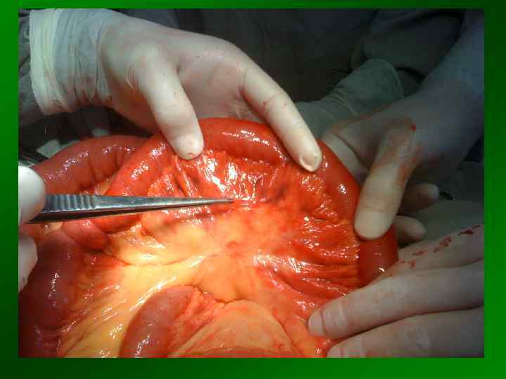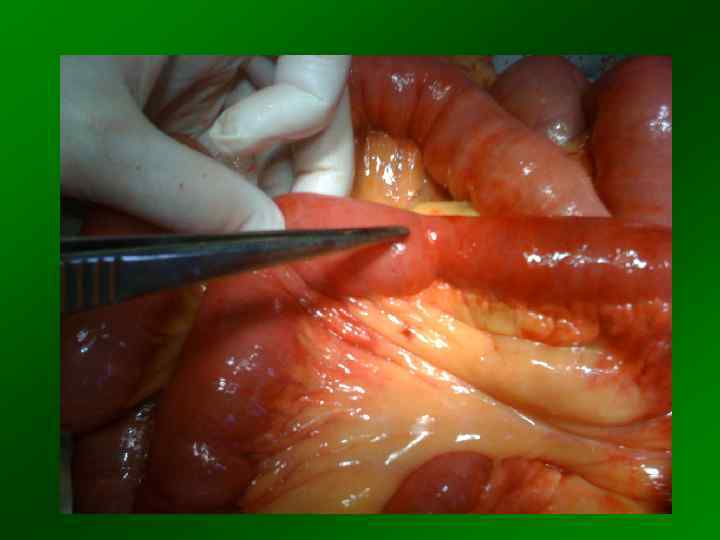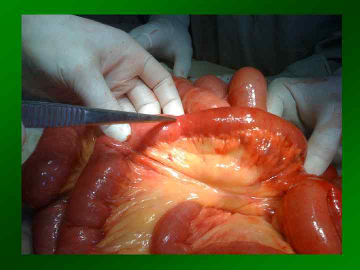 Резекция кишки при кишечной непроходимости Критерии определения жизнеспособности кишки: • Наличие пульсации сосудов брыжейки. • • Наличие перистальтики стенки кишки. Цвет серозного покрова (проведение реанимационных мероприятий, включающих введение новокаина в брыжейку), хотя по мнению многих авторов этот критерий не очень достоверен. Определение границ для резекции кишки : граница резекции кишки должна находиться на расстоянии 30 -40 см выше и на расстоянии 15 -20 см ниже от пораженного участка кишки.