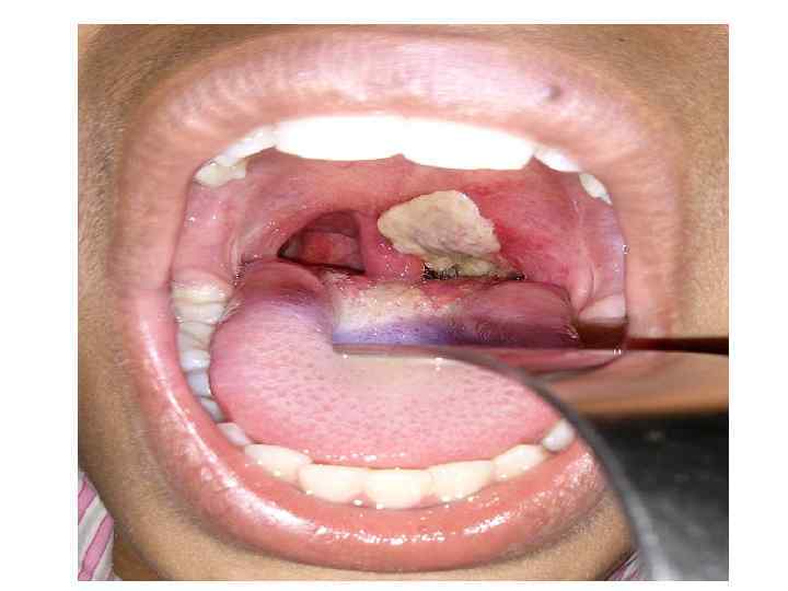 Распространенная дифтерия ротоглотки: серовато-белые отторгающиеся налеты на гиперемированных с цианотичным оттенком небных миндалинах, дужках и язычке.