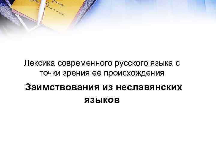 Лексика современного русского языка с точки зрения ее происхождения Заимствования из неславянских языков