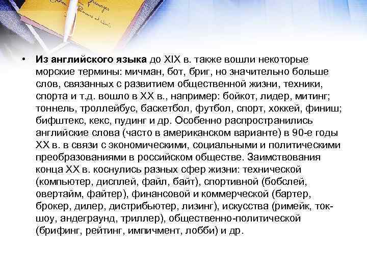 • Из английского языка до XIX в. также вошли некоторые морские термины: мичман, бот, бриг, но значительно больше слов, связанных с развитием общественной жизни, техники, спорта и т. д. вошло в XX в. , например: бойкот, лидер, митинг; тоннель, троллейбус, баскетбол, футбол, спорт, хоккей, финиш; бифштекс, кекс, пудинг и др. Особенно распространились английские слова (часто в американском варианте) в 90 -е годы XX в. в связи с экономическими, социальными и политическими преобразованиями в российском обществе. Заимствования конца XX в. коснулись разных сфер жизни: технической (компьютер, дисплей, файл, байт), спортивной (бобслей, овертайм, файтер), финансовой и коммерческой (бартер, брокер, дилер, дистрибьютер, лизинг), искусства (римейк, ток- шоу, андеграунд, триллер), общественно-политической (брифинг, рейтинг, импичмент, лобби) и др.