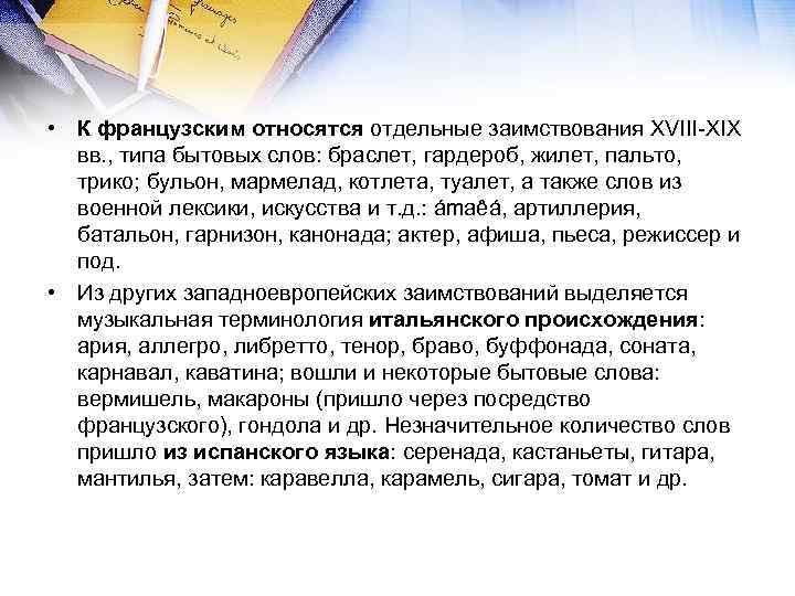 • К французским относятся отдельные заимствования XVIII-XIX вв. , типа бытовых слов: браслет, гардероб, жилет, пальто, трико; бульон, мармелад, котлета, туалет, а также слов из военной лексики, искусства и т. д. : ámaêá, артиллерия, батальон, гарнизон, канонада; актер, афиша, пьеса, режиссер и под. • Из других западноевропейских заимствований выделяется музыкальная терминология итальянского происхождения: ария, аллегро, либретто, тенор, браво, буффонада, соната, карнавал, каватина; вошли и некоторые бытовые слова: вермишель, макароны (пришло через посредство французского), гондола и др. Незначительное количество слов пришло из испанского языка: серенада, кастаньеты, гитара, мантилья, затем: каравелла, карамель, сигара, томат и др.