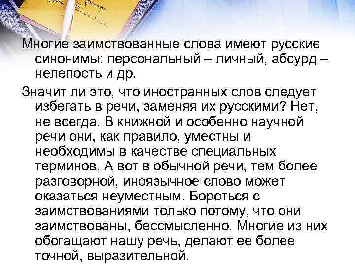 Многие заимствованные слова имеют русские синонимы: персональный – личный, абсурд – нелепость и др. Значит ли это, что иностранных слов следует избегать в речи, заменяя их русскими? Нет, не всегда. В книжной и особенно научной речи они, как правило, уместны и необходимы в качестве специальных терминов. А вот в обычной речи, тем более разговорной, иноязычное слово может оказаться неуместным. Бороться с заимствованиями только потому, что они заимствованы, бессмысленно. Многие из них обогащают нашу речь, делают ее более точной, выразительной.