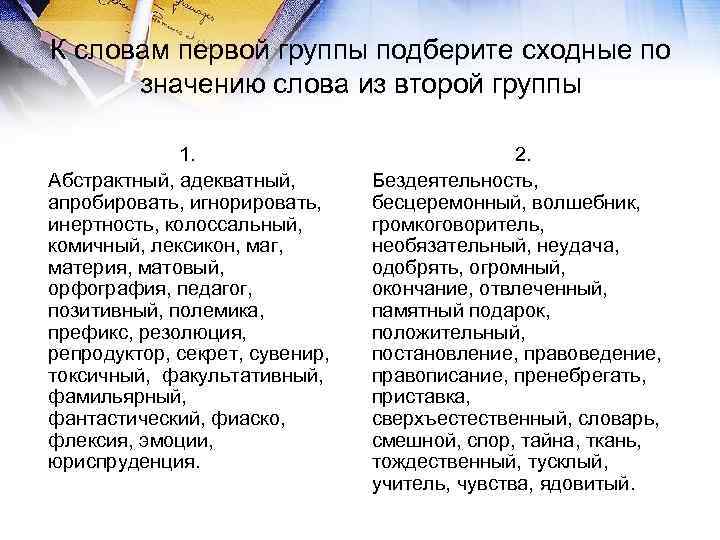 К словам первой группы подберите сходные по значению слова из второй группы 1. 2. Абстрактный, адекватный, Бездеятельность, апробировать, игнорировать, бесцеремонный, волшебник, инертность, колоссальный, громкоговоритель, комичный, лексикон, маг, необязательный, неудача, материя, матовый, одобрять, огромный, орфография, педагог, окончание, отвлеченный, позитивный, полемика, памятный подарок, префикс, резолюция, положительный, репродуктор, секрет, сувенир, постановление, правоведение, токсичный, факультативный, правописание, пренебрегать, фамильярный, приставка, фантастический, фиаско, сверхъестественный, словарь, флексия, эмоции, смешной, спор, тайна, ткань, юриспруденция. тождественный, тусклый, учитель, чувства, ядовитый.